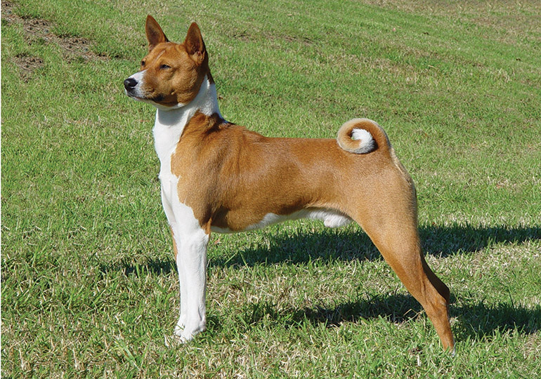 The Basenji has a wrinkled forehead, pricked ears, white chest, white tipped curly tail and white feet. It is small and gazelle-like, stands at about 40 to 43cm at the shoulder, weighs 9.5 to 11kg, and gives the impression of trim elegance.