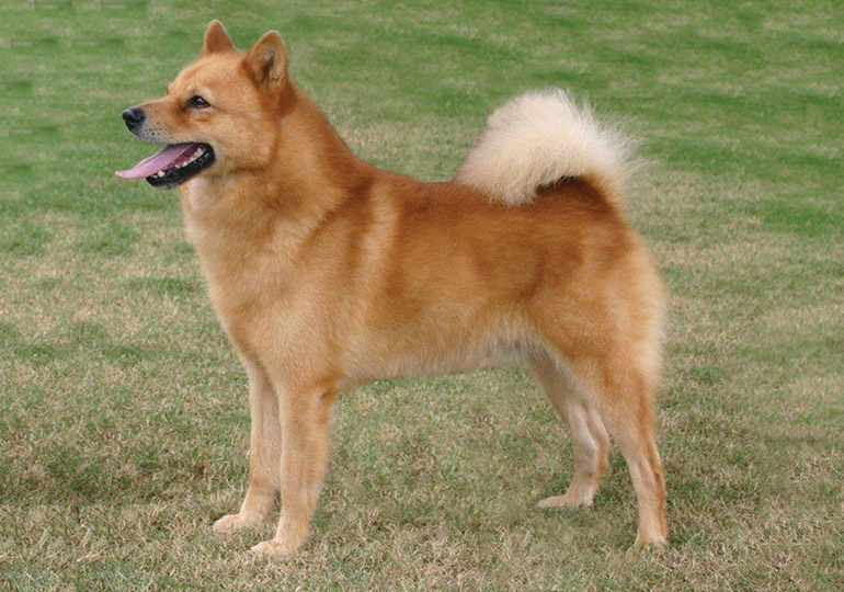 The Finnish Spitz is double coated in long, dense fur of a reddish-brown to yellow-red colour. Small, white markings are sometimes found on the feet or chest. Its keen, fox-like expression can be obscured if the fur is too coarse or overdone. A square build with a long and straight back, the neck is muscular and short. The tail curves in a pronounced arch forward, downward and backward against the thigh. The head is cleancut and medium size.