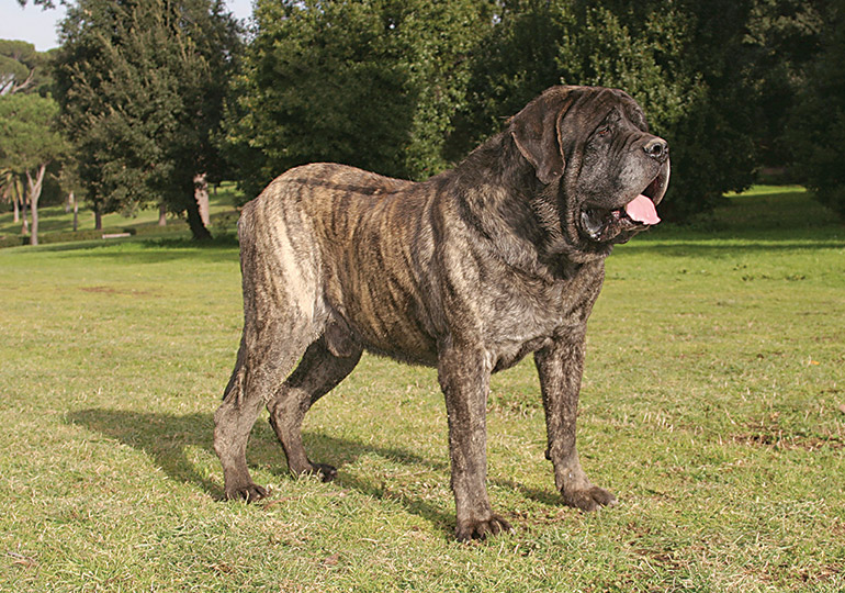 The very name of this breed automatically makes one think ‘big’, and the Mastiff certainly is a very large dog. When looking at a good specimen of the Mastiff, one should see a dog of immense size, a head that looks square from all angles and a broad deep muzzle. The ears should be set on high and taper to a ‘v’ shape. The eyes are dark. The body should be longer than that of a Bullmastiff with legs showing strong bone and nice tight feet. Movement should show reach and drive. To use an old saying, Mastiffs should power around the ring like a Clydesdale, not a thoroughbred. The colours are fawn, apricot and brindle and in each case it must have a black mask.