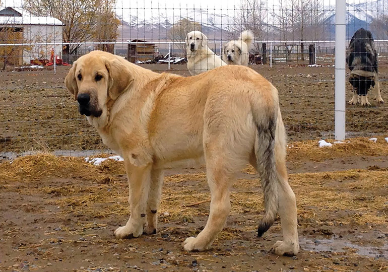 The Spanish Mastiff, is a giant breed of dog, originating in Spain, originally bred to be a guard dog whose specialised purpose is to be a livestock guardian dog protecting flocks (and occasionally herds) from wolves and other predators. The mountain dog type has a heavier coat. (1)