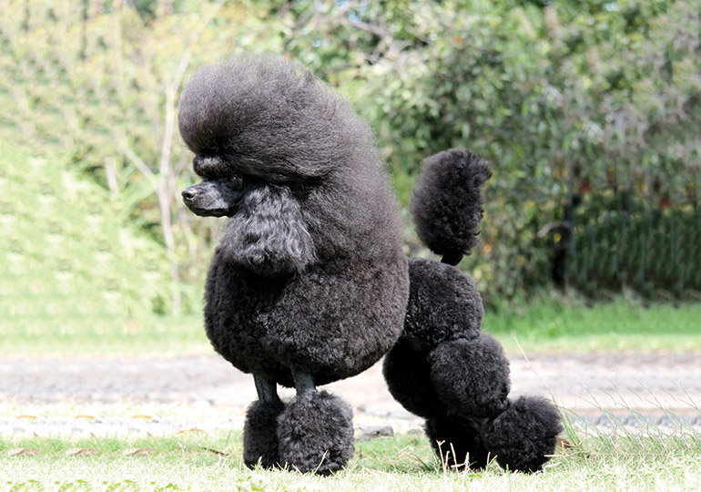 The Poodle is a normally constructed dog without exaggeration. It has a proud carriage standing and moving, its tail held high and a long, strong neck suited to its work. The breed has a long, clean-lined head and strong and well-chiselled foreface. The typical Poodle expression requires a correct head and foreface, a dark almond eye and long, wide, low-set ear leathers hanging close to the face. The profuse coat is dense and of harsh texture for water retrieving. The traditional lion clip is strongly recommended for showing. All solid colours are accepted.