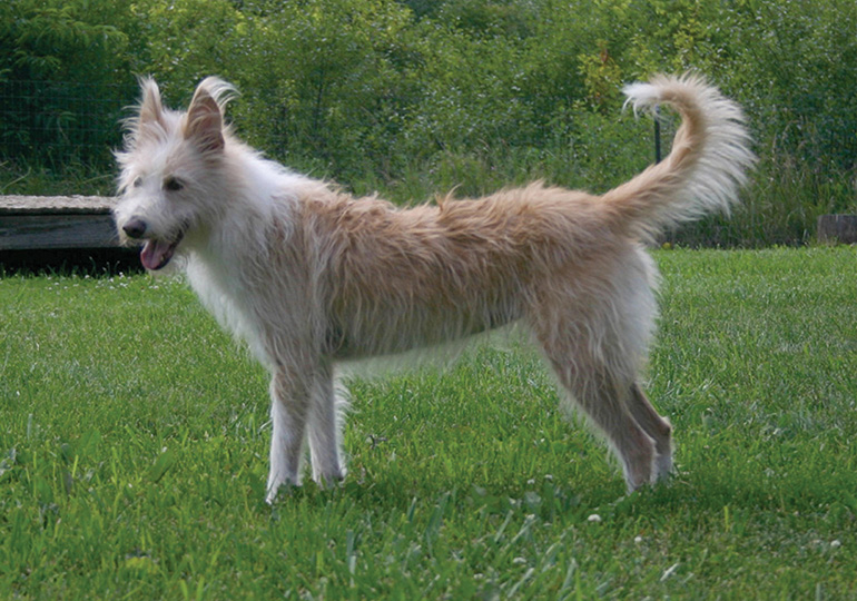 Quadrangular pyramid head, with erect ears, sickle shaped tail, well proportioned, with sound construction and well muscled; very lively and intelligent; sober and rustic. It exists in three sizes, (Small, Medium, Large) with two varieties of coat: smooth and wire. (3)