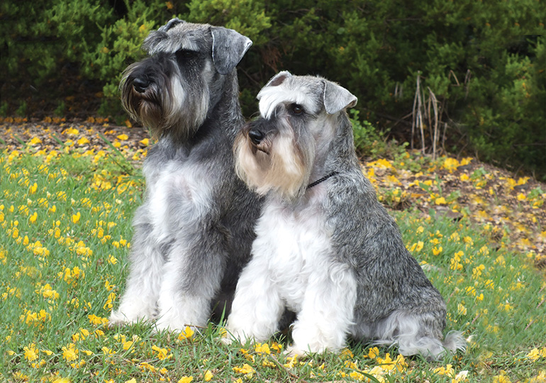 The name Schnauzer refers to their distinctive facial appearance. Beards and eyebrows are a feature of all three breeds. The Schnauzer expression is characterised by an alert, “down the nose” expression enhanced by the correctly set ear, dark eye, dark facial mask in the salt and pepper and black and silver and their leg furnishings. They have a harsh outer coat and soft undercoat. They do not shed their coats and require regular stripping for the show ring so they can be presented with an outer wiry, coarse coat against a short undercoat. Clipping of the coat is usual for dogs that are not shown.