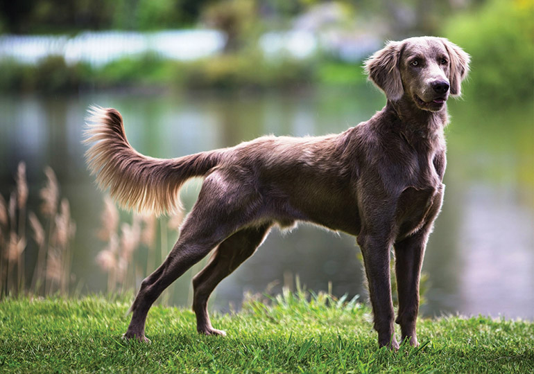 The aristocratic and athletic Weimaraner and long coated Weimaraner, is a medium to large, balanced, hunting dog, having well laid back shoulders, good length of back set in a straight line (length of body to height at withers is approximately 12:11), great driving power from the rear and must present a picture of a well-muscled dog capable of doing a day’s work in the field. The Weimaraner’s hunting ability is paramount, so his conformation should reflect this.
