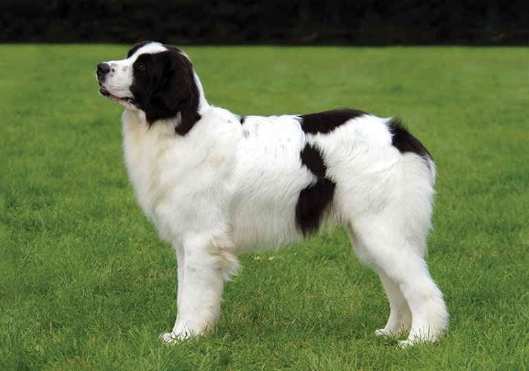 This breed has a broad muscular neck, a straight and level back, a muscular loin and a deep chest with well sprung ribs. The strong tail is densely covered with bushy hair. When the dog is at rest, the tail forms a slight curve at the end and hangs down. On the move, the tail is carried straight out with a slight curve at the end. This breed has a double coat. The topcoat is long, straight and soft to the touch. The slightly wavy topcoat is thick and oily. The thick undercoat is oily too. The predominantly white coat is marked with black patches on the body. The head is black and ears are black. A white blaze that runs from the muzzle to the collar enhances the impressive appearance of the dog. 5.