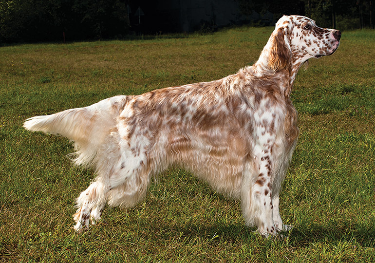 The English Setter gives the immediate impression of being a sporting dog of aristocratic and noble heritage. It is of medium height: dogs are between 65 and 69cm at the withers and bitches are between 61 and 65cm. It projects an image of elegance both in appearance and on the move and exhibits the stamina required to allow it to work all day in the field. With its head carried high, the English Setter has a strong jawline and a long, muscular neck. It has bright, expressive, brown eyes and low ears, hanging in neat folds close to the cheek.
