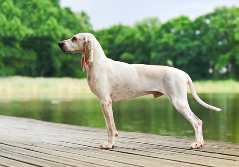 The Porcelaine is a medium sized, French scent hound. He is elegant, energetic and an excellent hunter. He is very white in colour, with roundish, orange spots, often with characteristic orange ticking on the ears. He is proud, graceful, and cat-like with a stunning appearance. He is athletic, well-muscled, not heavy, and his coat is shiny, thin and close lying.