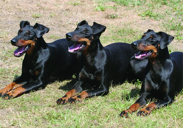 Legs are in proportion to the dog, neither too short nor too long. Colour is jet black with rich mahogany-tan markings. The coat is smooth and glossy with a firm texture.
