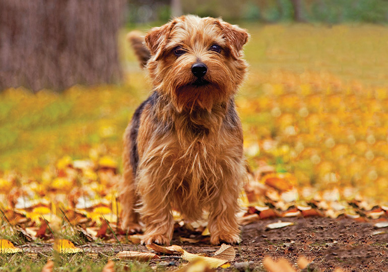 While regular grooming is needed to maintain the breed’s weatherproof coat, excessive clipping is not desirable. The Norfolk Terrier’s nails need to be kept short and its teeth clean. The breed makes for a good family companion and is especially good with children. It is, however, important to remember what the Norfolk Terrier was bred for: it is not a lap dog and requires regular and varied exercise. The breed also gets on well with cats, especially if it grows up alongside them.