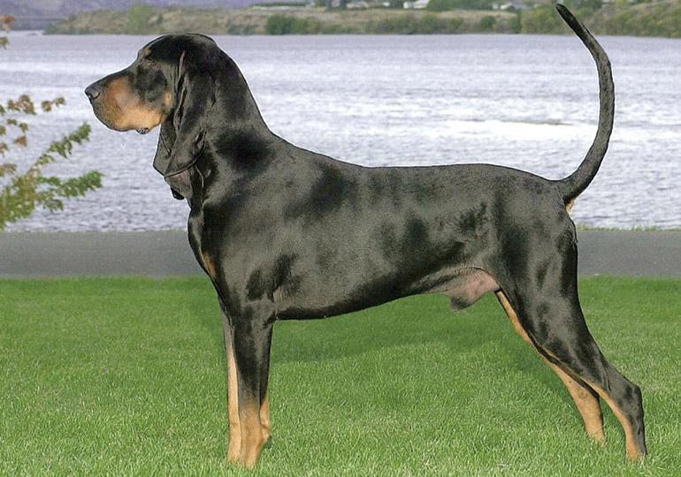 The Black and Tan Coonhound's bark is loud and baying; it has been described as a deep howl. The breed standard includes muscular legs that are long in proportion to body length. The tail is set slightly below the natural line of the back. (1)