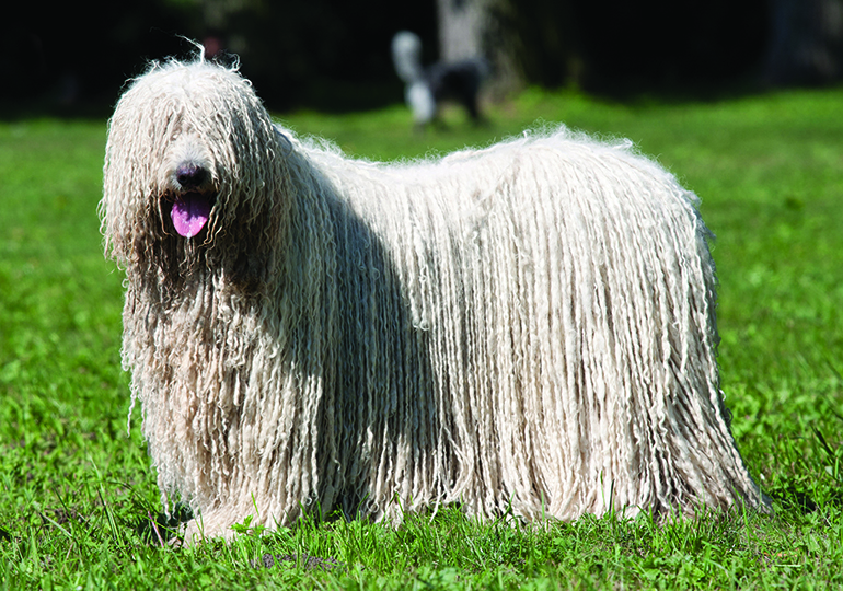 The Komondor's coat is long, thick, and strikingly corded, about 20 – 27 cm long (the heaviest amount of fur in the canine world), which resembles dreadlocks or a mop. The puppy coat is soft and fluffy. However, the coat is wavy and tends to curl as the puppy matures. A fully mature coat is formed naturally from the soft undercoat and the coarser outer coat combining to form tassels, or cords and will take around two years to form. Some help is needed in separating the cords so the dog does not turn into one large matted mess. The length of the cords increases with time as the coat grows. Moulting is minimal with this breed, contrary to what one might think (once cords are fully formed). The only substantial shedding occurs as a puppy before the dreadlocks fully form. (1)(4)